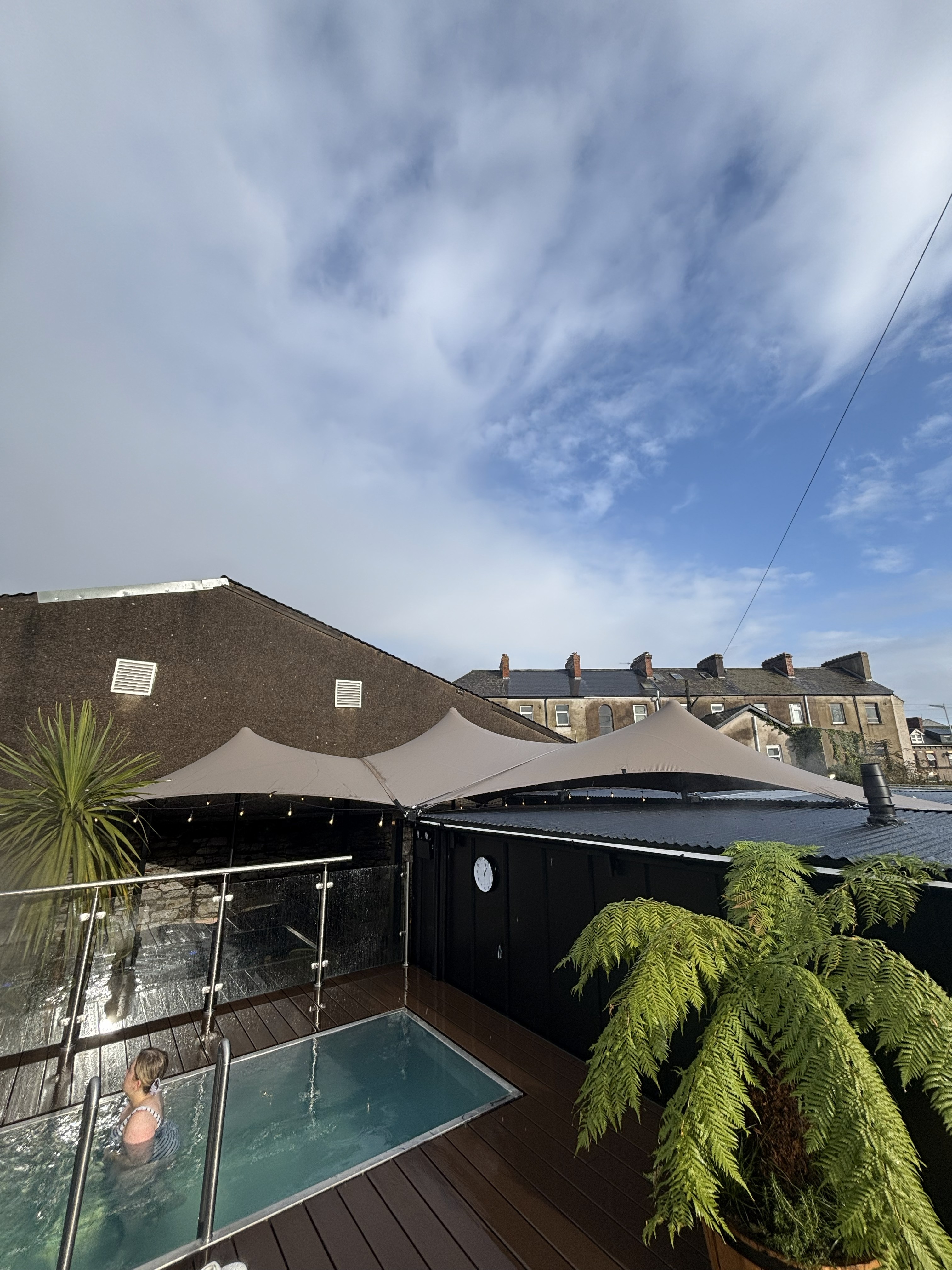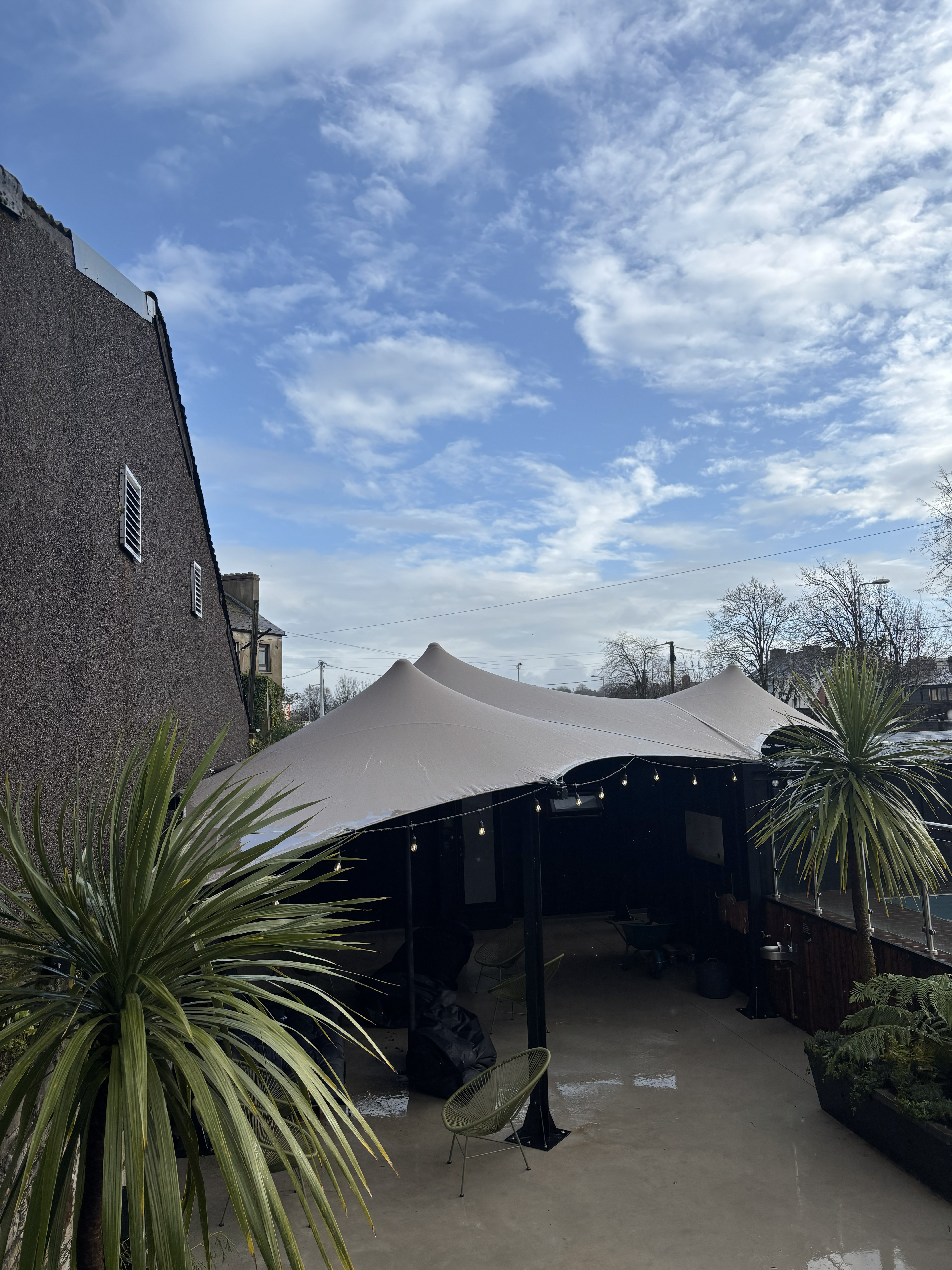We recently completed a custom three-sided stretch tent installation at The Hot Box Sauna in Cork, designed and cut to perfectly fit the space.
